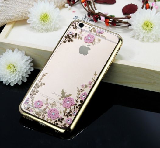 Прозрачный чехол с цветами и стразами для Apple iPhone 7 plus (5.5") с глянцевым бампером Золотой/Розовые цветы