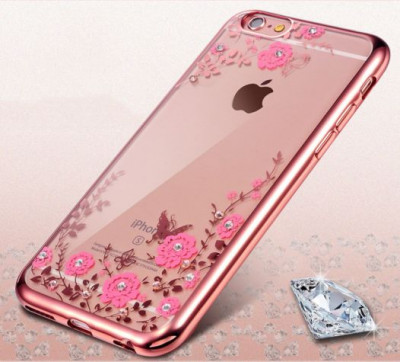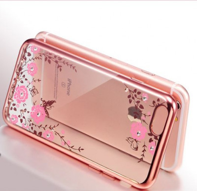 Прозрачный чехол с цветами и стразами для Apple iPhone 7 plus (5.5") с глянцевым бампером Розовый золотой/Розовые цветы