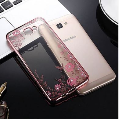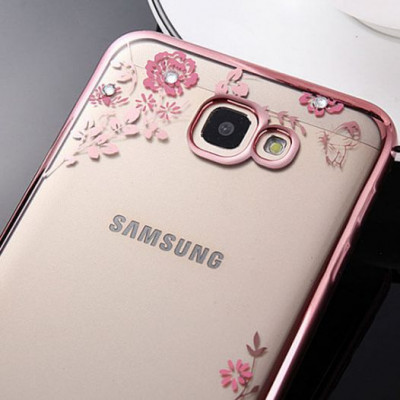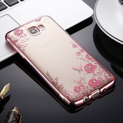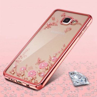 Прозрачный чехол с цветами и стразами для Samsung G610F Galaxy J7 Prime (2016) с глянцевым бампером Розовый золотой/Розовые цветы