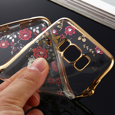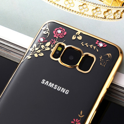Прозрачный чехол с цветами и стразами для Samsung G955 Galaxy S8 Plus с глянцевым бампером Золотой/Розовые цветы