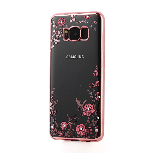 Прозрачный чехол с цветами и стразами для Samsung G955 Galaxy S8 Plus с глянцевым бампером Розовый золотой/Розовые цветы