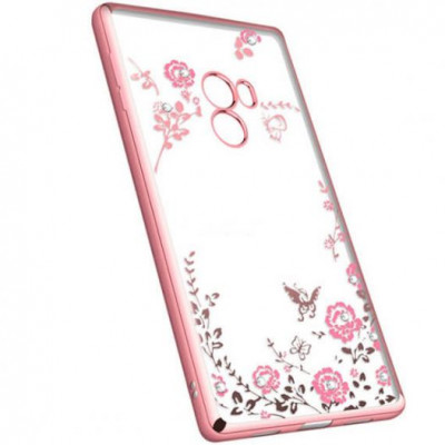 Прозрачный чехол с цветами и стразами для Xiaomi Mi MIX с глянцевым бампером Розовый золотой/Розовые цветы