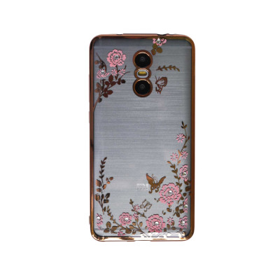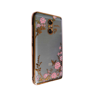 Прозрачный чехол с цветами и стразами для Xiaomi Redmi Pro с глянцевым бампером Золотой/Розовые цветы