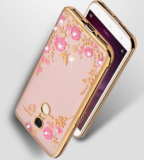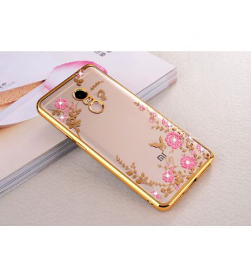 Прозрачный чехол с цветами и стразами для Xiaomi Redmi Note 4 с глянцевым бампером Золотой/Розовые цветы