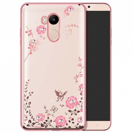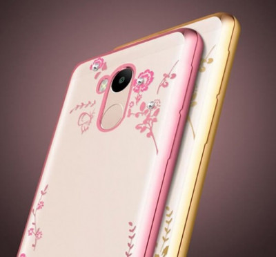 Прозрачный чехол с цветами и стразами для Xiaomi Redmi 4 Pro / Redmi 4 Prime с глянцевым бампером Розовый золотой/Розовые цветы