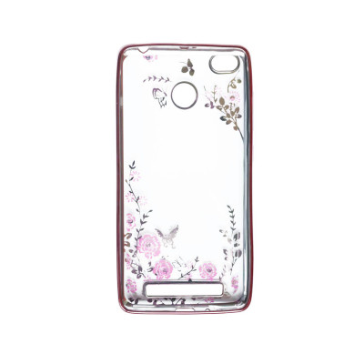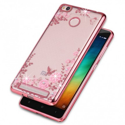 Прозрачный чехол с цветами и стразами для Xiaomi Redmi 3 Pro / Redmi 3s с глянцевым бампером Розовый золотой/Розовые цветы
