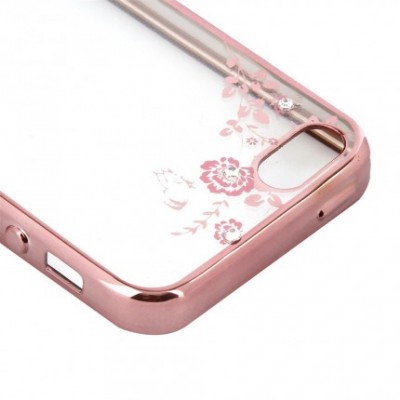 Прозрачный чехол с цветами и стразами для Apple iPhone 5/5S/SE с глянцевым бампером Розовый золотой/Розовые цветы