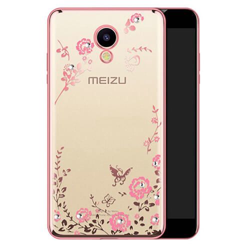 Прозрачный чехол с цветами и стразами для Meizu M5 с глянцевым бампером Розовый золотой/Розовые цветы