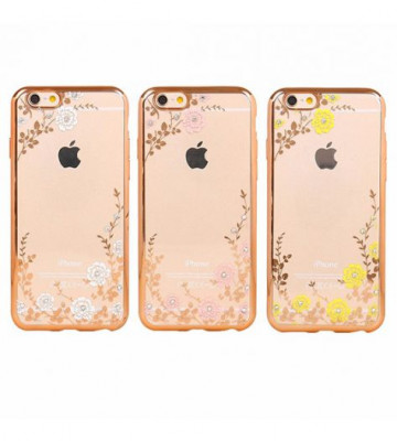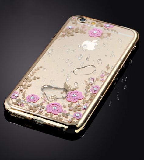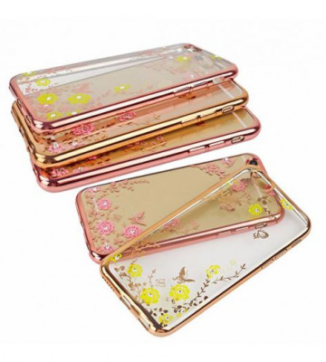 Прозрачный чехол с цветами и стразами для Apple iPhone 7 (4.7") с глянцевым бампером Золотой/Розовые цветы